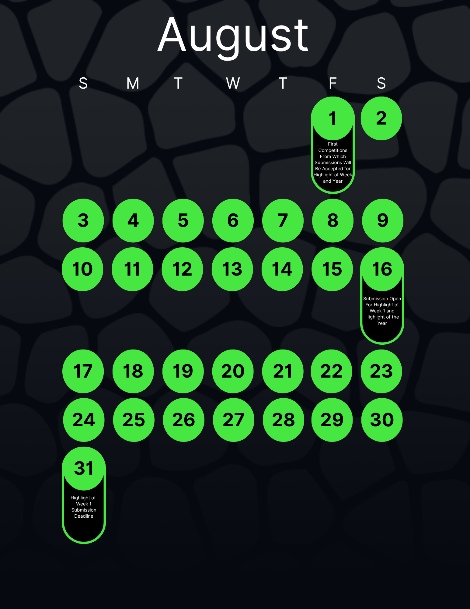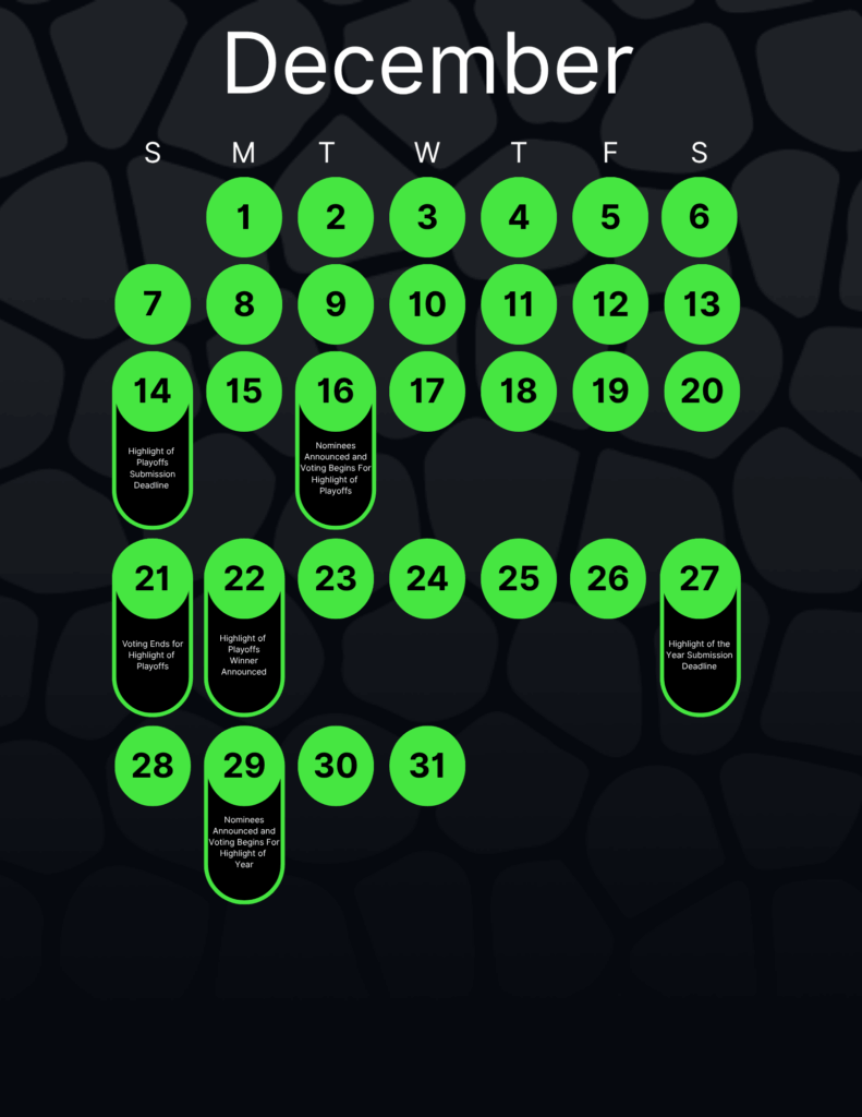 One submission per player per weekly contest. Three submissions per team per weekly contest. Only one submission per player and three per team will be eligible for final voting for highlight of the year